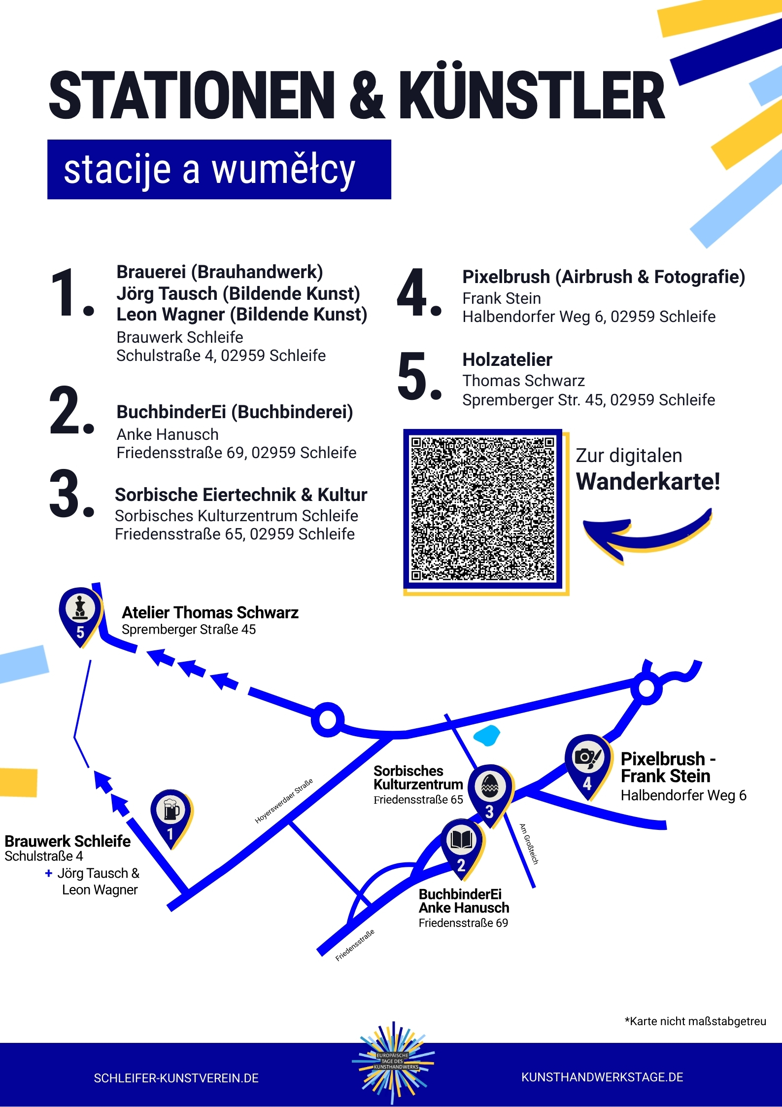 Am 12. April öffnen von 10 – 17 Uhr 5 besondere Orte in Schleife Ihre Türen, um gemeinsam mit Gastkünstlern einzigartige Kunst, Kultur und kreatives Handwerk zu präsentieren. Dort gibt es Einblicke in Ateliers, Werkstätten und Ausstellungen – ein Tag voller Inspiration zum Staunen, Anfassen, Kosten und auch Mitnehmen.