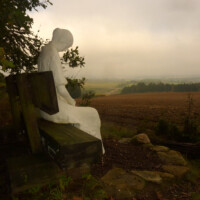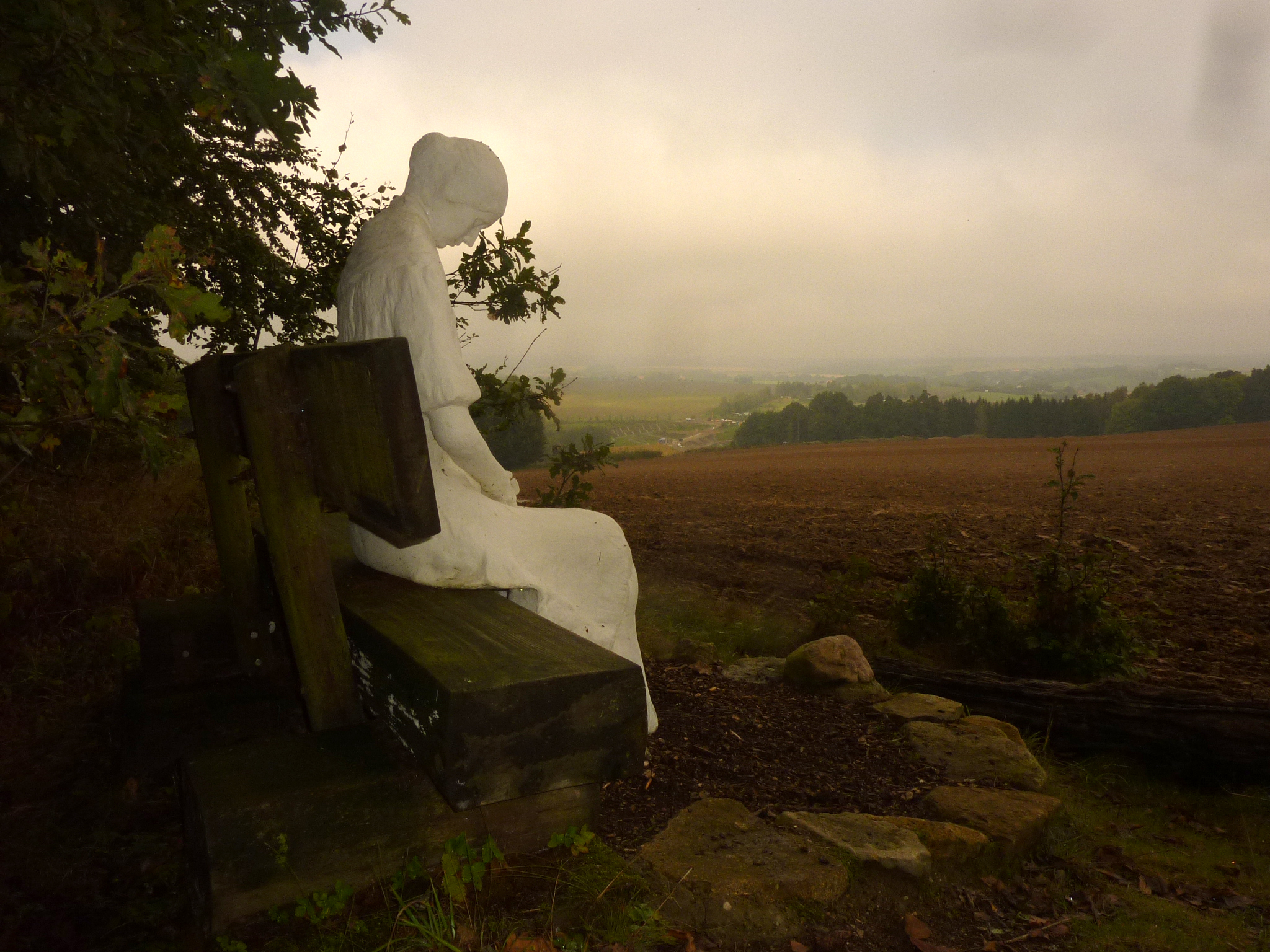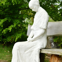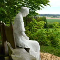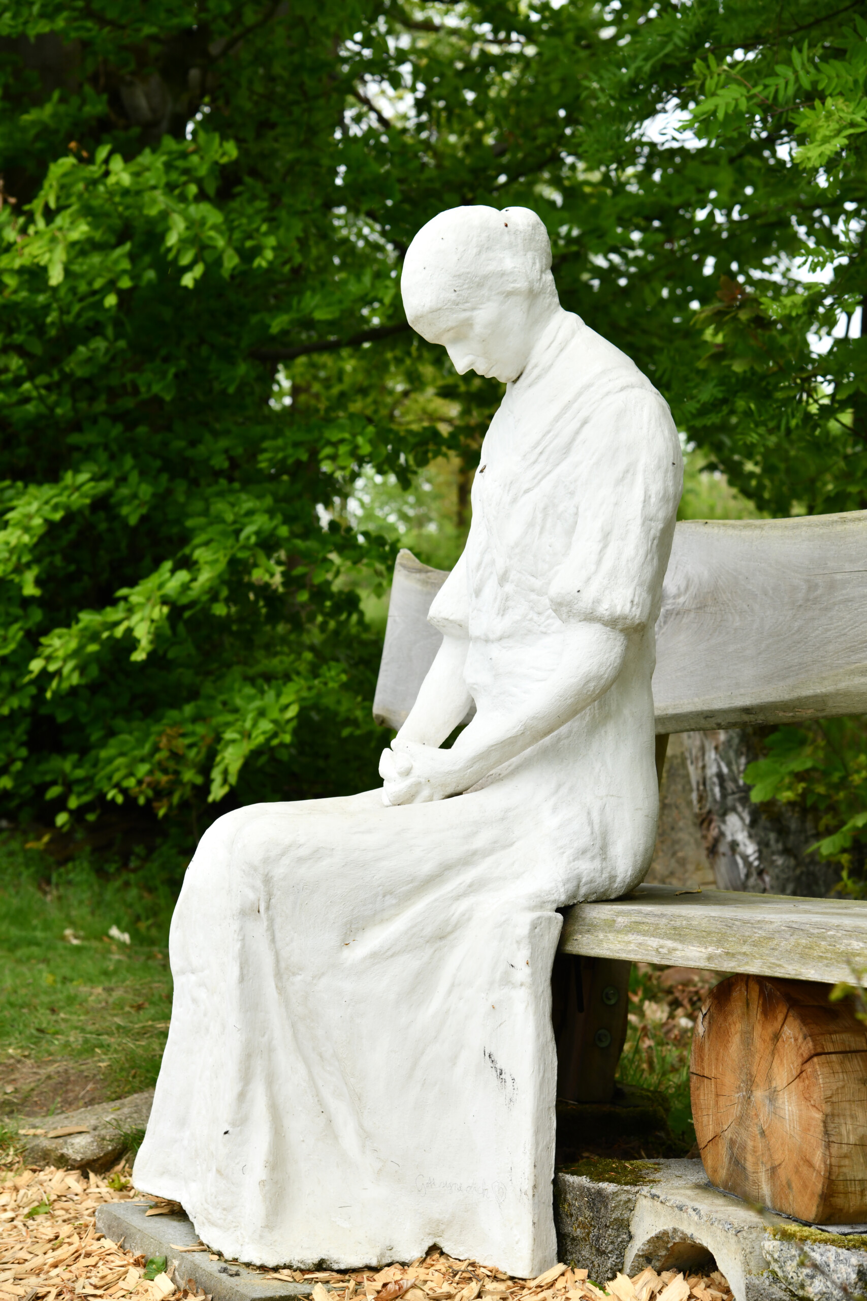 Eine Frauenfigur sitzt am Waldrand auf einer Bank, wo genug Platz ist, dass man sich dazusetzen kann. Sie ist ins Gebet vertieft.